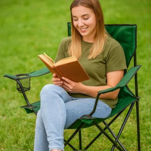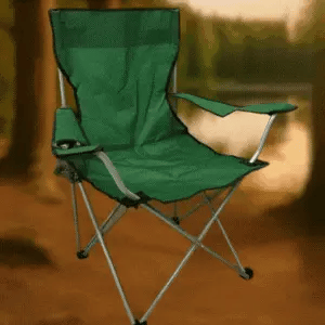 Tu silla plegable con apoyabrazos, portavaso y su bolso de transporte.