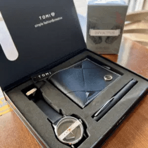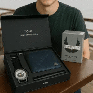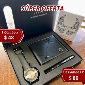 Incluye un reloj sumergible, una billetera elegante, una pluma de diseño exclusivo y un perfume de 100 ml con fragancia masculina.